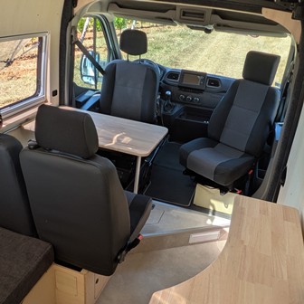 Nous pouvons ajouter des assises, installer une banquette 2 places convertible en lit à l’arrière, remplacer la banquette passager ou le siège conducteur par un siège pivotant, ajouter une embase pivotante à votre siège conducteur…